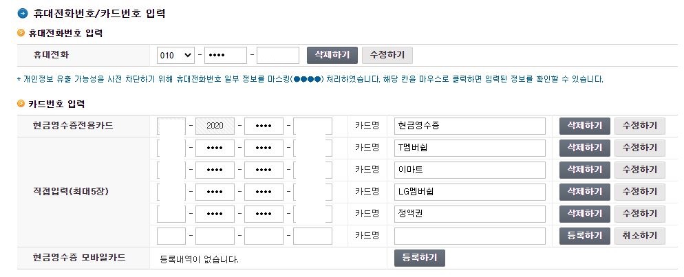 현금영수증 발급수단으로 카드등록도 가능하지만