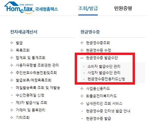 국세청 홈텍스 현금영수증 발급수단에