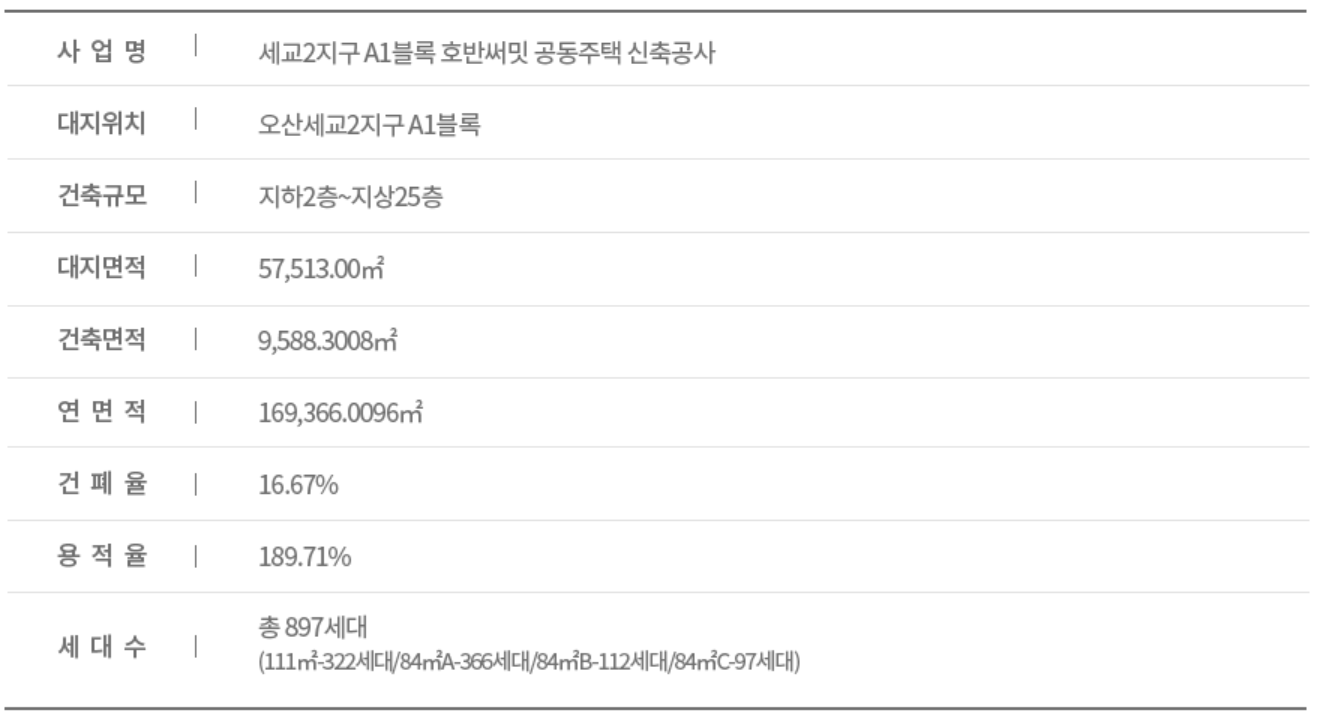 경기도 오산시 궐동 세교2지구 A1블록에 지하 2층 ~ 지상 25층, 14개동으로 전용면적 84㎡와 111㎡로 구성되어 총 897세대입니다.